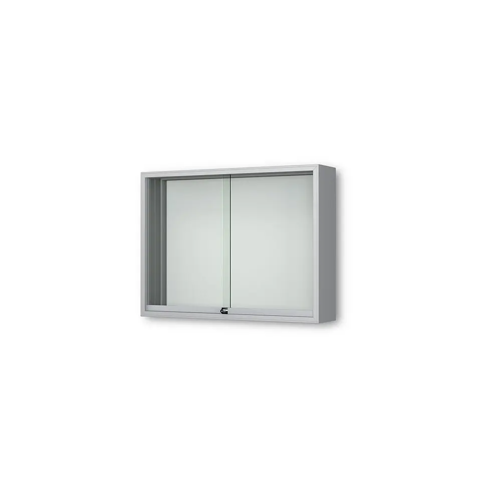 Schaukasten Fortis - eckig - mit Schiebetüren - 210 mm Gehäusetiefe, rollengelagerte Schiebetüren, höchster Brandschutz (A1) Größe - 18 × DIN A4 • 1370 × 1010 mmSichtfläche: 1330 x 950 mm   Öffnung - rollengelagerte SchiebetürenVerglasung - Einscheiben-Sicherheitsglas / ESGOberfläche - Eloxierung in matt-silber (E6/EV1)Beleuchtung - ohne BeleuchtungSchließung - Sicherheitsschlösser mit je 2 SchlüsselnRückwand - weiße, magnethaftende Rückwand inkl. 10 Magnete