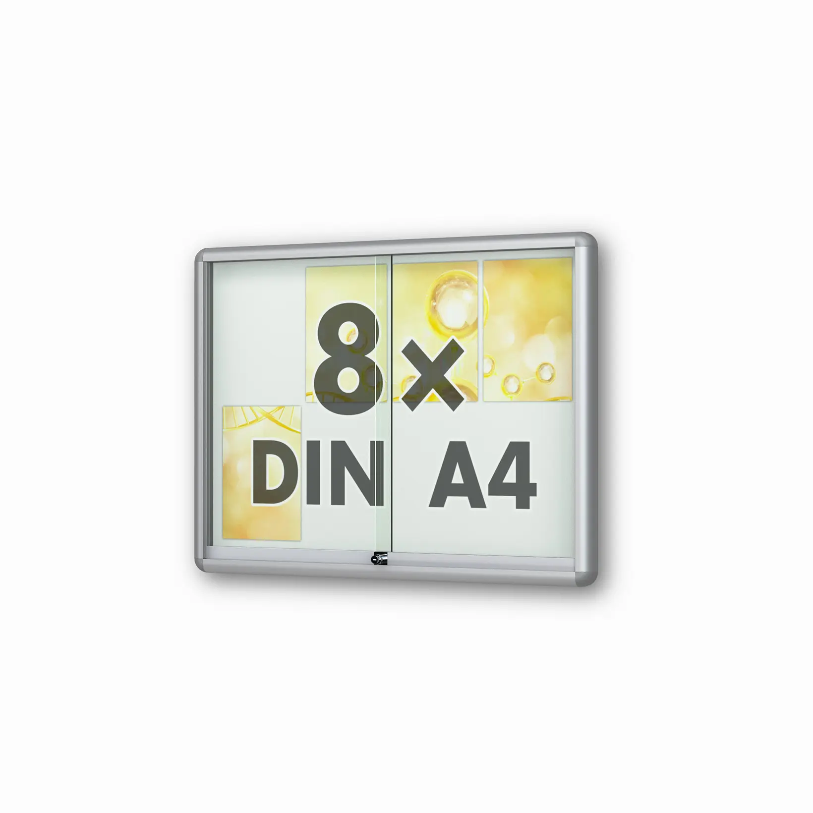 Vitrinen.de ➤ "8 x DIN A4 Schaukasten Moveo - "die Schulvitrine" - 50 mm Bautiefe - mit Brandschutzklasse A1 - Rollengelagerte Schiebetüren✓ abschließbar✓ ESG-Sicherheitsglas✓"