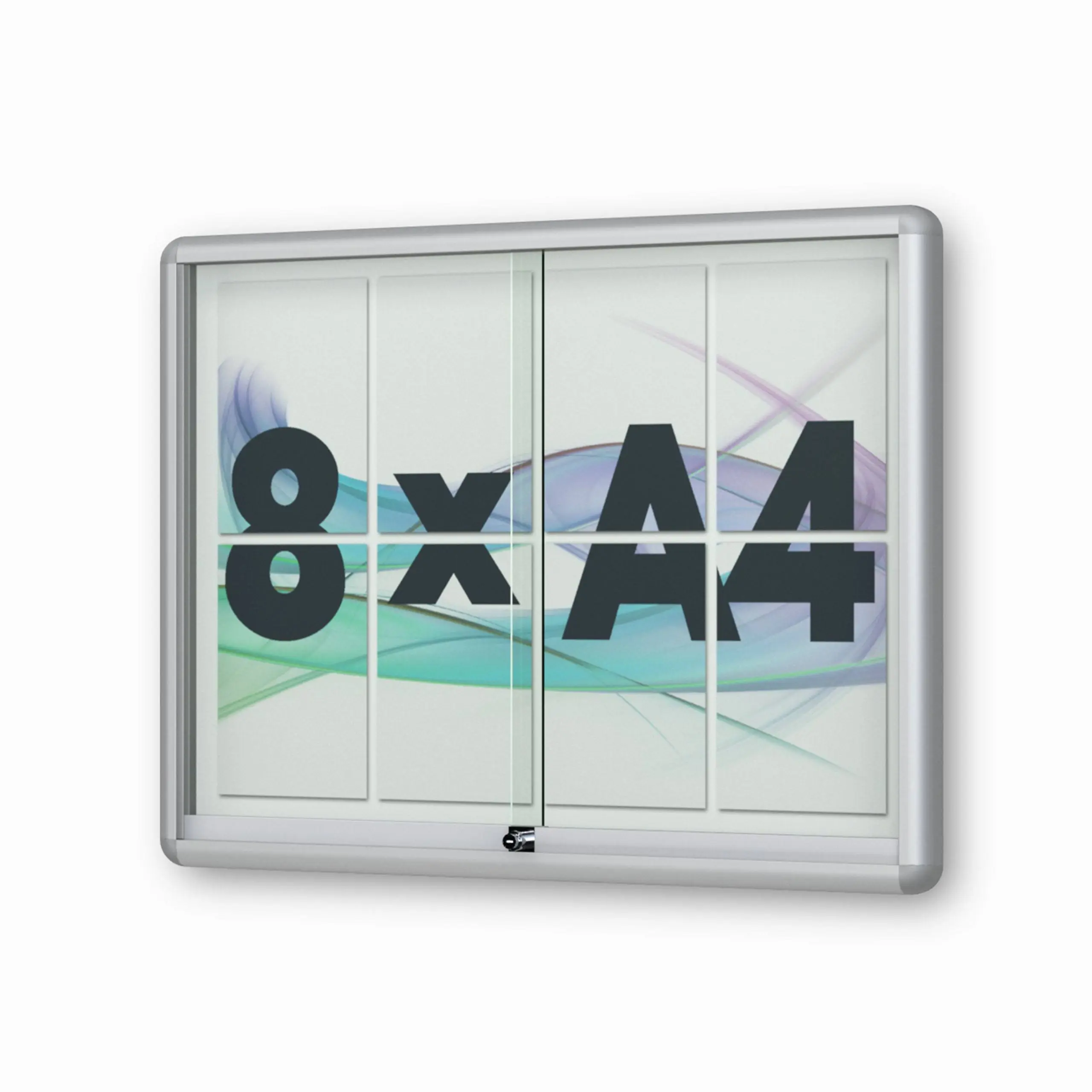 Vitrinen.de ➤ "8 x DIN A4 Schaukasten Moveo - "die Schulvitrine" - 50 mm Bautiefe - mit Brandschutzklasse A1 - Rollengelagerte Schiebetüren✓ abschließbar✓ ESG-Sicherheitsglas✓"